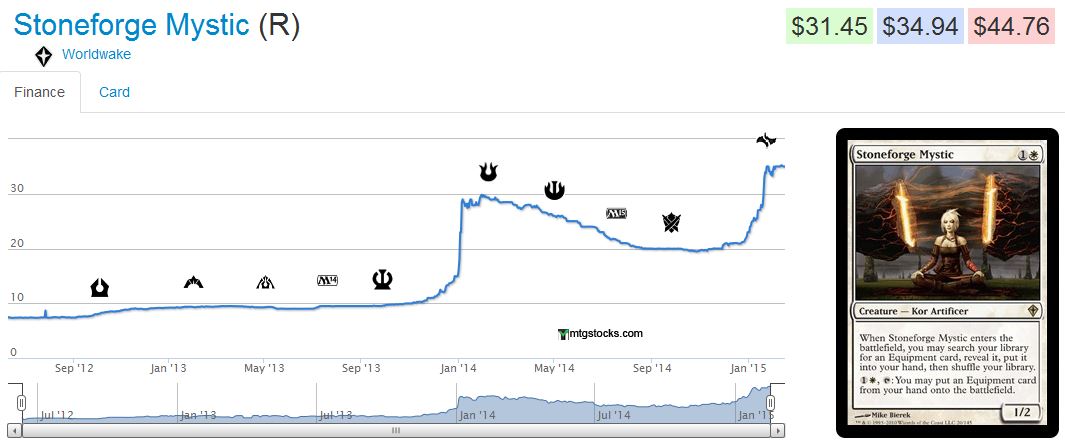 But what I find even more compelling is the price performance of the two cards over the past couple months. Stoneforge Mystic recently shot up, and I was advocating a buy on this card during that timeframe. But now that sheās jumped to $35, she appears to have stabilized.