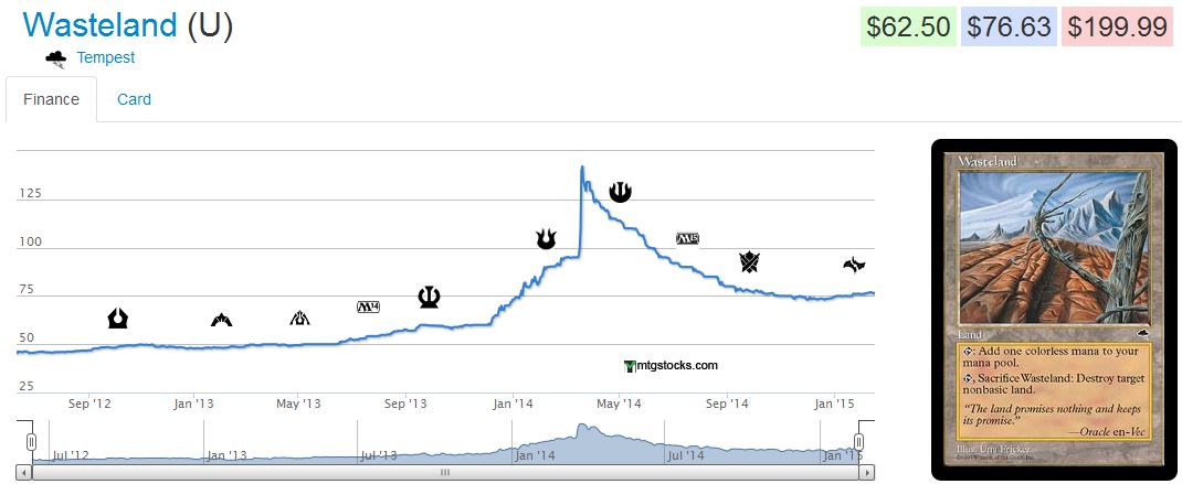 The Tempest land is only now just bouncing off a local minimum. The slope is going to be more subtle, meaning it could take a while for Wasteland to move measurably. But in terms of remaining upside, Wasteland can nearly double if the metagame shifts in a favorable way.