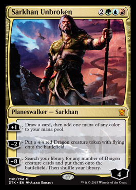 Like many planeswalkers of this era, Sarkhan comes to us with two relevant abilities and one that's likely never going to be used in constructed. With the apparent lack of constructed playable dragons spoiled so far, his ultimate is realistically going to be "go get the other two Stormbreath Dragons out of your deck and put them into play too" - not exactly a reason to give up drawing cards and pooping out 4/4 flyers.