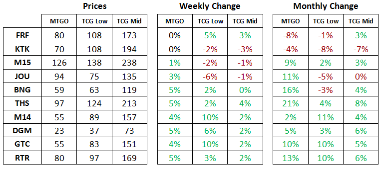 The first two sets of Theros block have solid price gains in paper over the last month, while M15 and JOU have been flat. On MTGO, each of the sets is off of their mid-winter peaks; as a whole, they are neither under- nor overvalued.