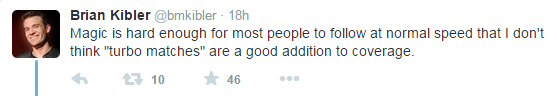 Kibler makes a good point with regard to the perspective of the average viewer. You also miss some relevant information in the coverage of these matches, not the least of which being life totals. Not to mention that watching a complex board state at ludicrous speed trivializes many of the decisions being made.