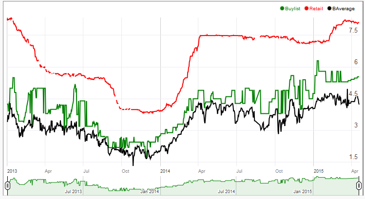The stock chart reveals that Sulfur Falls steadily climbed this time last year and yet again last quarter. Each of these climbs correspond to the opening of Modern season. The card is readily seen in several Top 8 decks at the state level including Splinter Twin. Unlike scry lands, (Temple of Malady, Temple of Enlightenment, etc.) these lands actually see Modern play, which will be a huge factor in predicting their upward value.