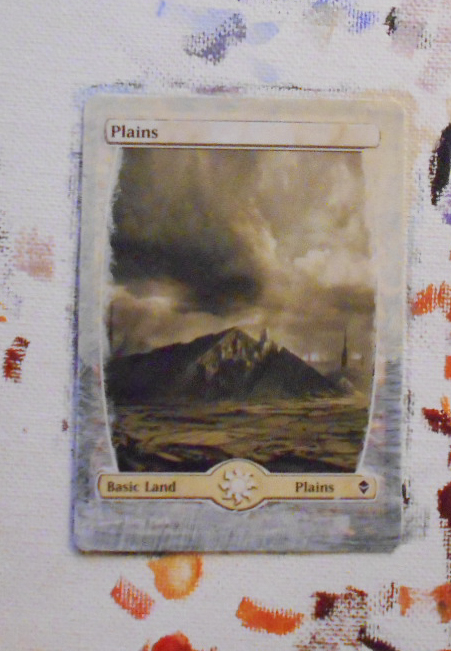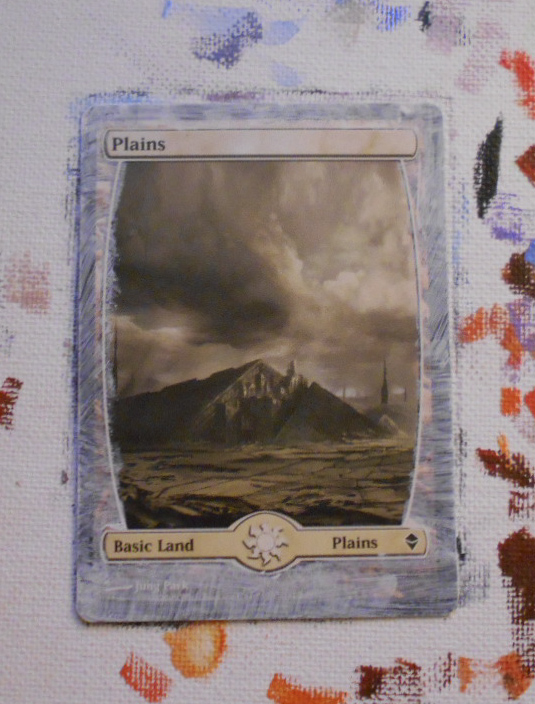 When you've finished, you'll want your card to look roughly like the picture here. The purpose of this priming layer is two-fold. First it allows the next layers of paint a more suitable surface with which to hold onto of the card. Second, it covers the original colors of the card and stops them from showing through and affecting the colors that we are putting down.