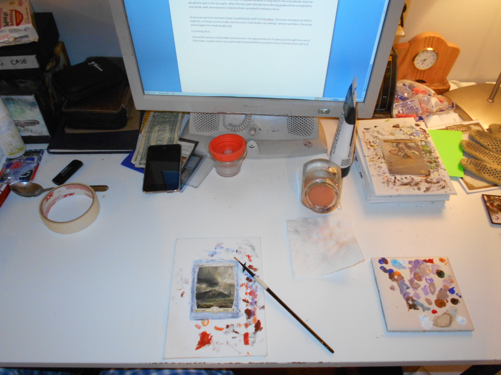 You need to set up a reasonable area to work in. You don't need a lot of space, just enough for a cup of rinse water, a paper towel, your paint palette and whatever you have chosen to mount your card to.