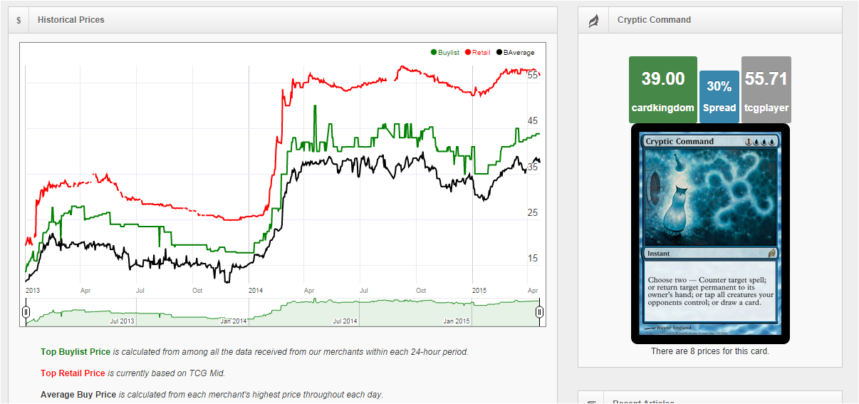 So looking at the graph, Cryptic Command saw a fairly good decline in retail price once the June 07 2015 date hit and Modern Masters was being purchased and drafted. The price depressed for a little while, but it wasn't long until it started to appreciate again. Very sharply, and right around February, just seven months later. Roughly a 111% increase.