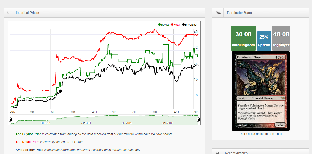 The chart looks back to the release date of Modern Masters, June 7 2013. Fulminator Mage increased 142% the very next month in July. So the time frame on certain cards was very drastic, while others took a few months to suddenly jump in price.
