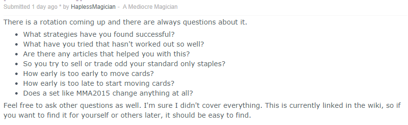 We've been discussing a technical analysis, trying to look at these trends as something that will repeat itself. I’m more of a fundamental financier, and while there are trends in MTGFinance, there are also intangibles as well. Most other stock markets don’t have to really worry about if X Stock is in the next new Y best deck. Or if stocks get "reprinted" in Modern Masters.