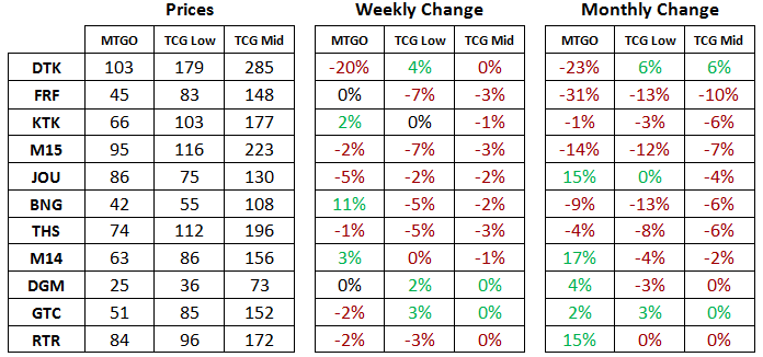All MTGO set prices this week are taken from Goatbotās website, including the āFull Setā price for DTK, which was available at the time prices were collected. All weekly changes are now calculated relative to Goatbotās āFull Setā prices from last week, except for DTK which is relative to the sum of singles prices from last week. Monthly changes are still relative to Supernovaās prices from last month before their prices started diverging from market prices.