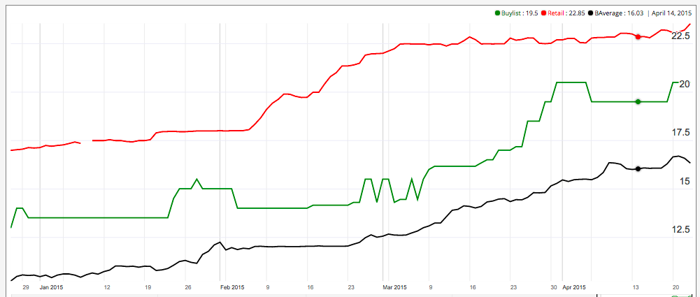 Before February's run-up, Cavern of Souls had been stable for many months. There was really no catalyst for growth, and you can see that neither the buy nor sell prices moved much at all. However, with Modern Masters 2 looming large on the horizon and a guarantee that Cavern won't see a reprint (at least, not in MM2), it seems to have been pegged as a juicy target for speculators.