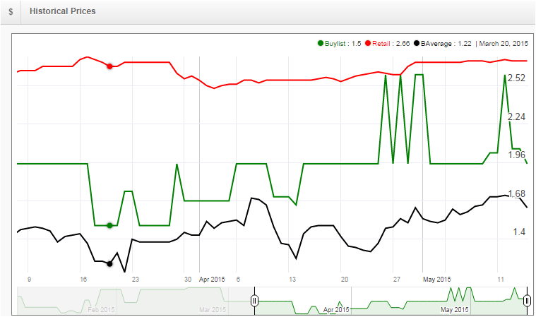 I also provided the buylist stock chart--it seems vendors are changing the buylist on these all the time. Though they’re offering more than market value sometimes, with the buylist moving up over 2$ some days. I highlighted the Fifth Dawn version, but there was a similar trend on buylist fluctuations on each version of the card.