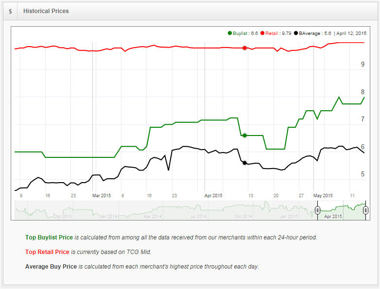 The buylist chart also indicates some positive movements from vendors. In this month alone, the buylist keeps fluctuating in an upward trend, and has leveled off around 8/7.75$. Should MM2015 generate more Modern players, it looks like vendors are putting faith into the card by offering a very attractive buylist right now. Affinity, like I mentioned previously, will be a go-to option as a budget-friendly deck that’s also viable.