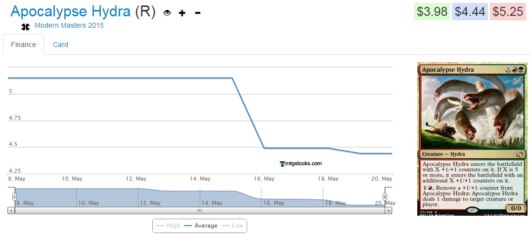 5. Apolcalypse Hydra (MM2015) (-13.8%) - This card's price was heavily propped up by casual demand from a lackluster set. Being a mythic in that set the price was pretty stable, but a reprinting as a regular rare in MM2015 has killed any short-term profits to be had on this card (either the Conflux or the MM2015 versions). I expect both will continue to drop.