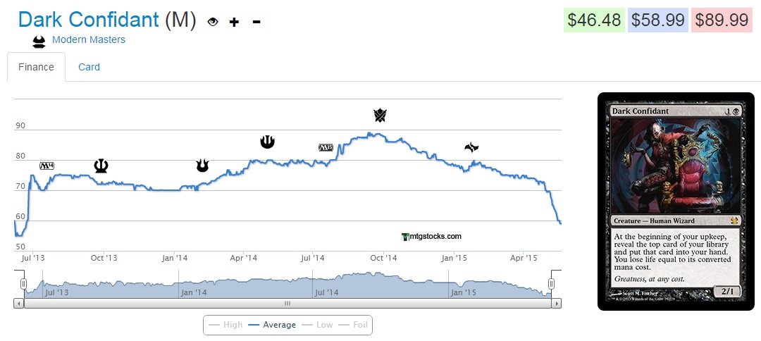 1. Dark Confidant (-12.65%) - This one is no surprise. Dark Confidant is seeing very little Modern or Legacy play now and his announcement in MM2015 just adds more to the supply when demand was already waning.
