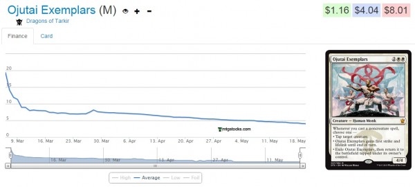 7. Ojutai Exemplars (DTK) (-11.1%) - This DTK card had a lot of hype going into its prerelease that has simply never panned out. Similar to Ojutai's Command, a lot of pros expected a solid white-blue deck to rear its ugly head back into Standard, though it's humorous to see that both Ojutai's Examplars and Command pre-sold for more than Ojutai himself.