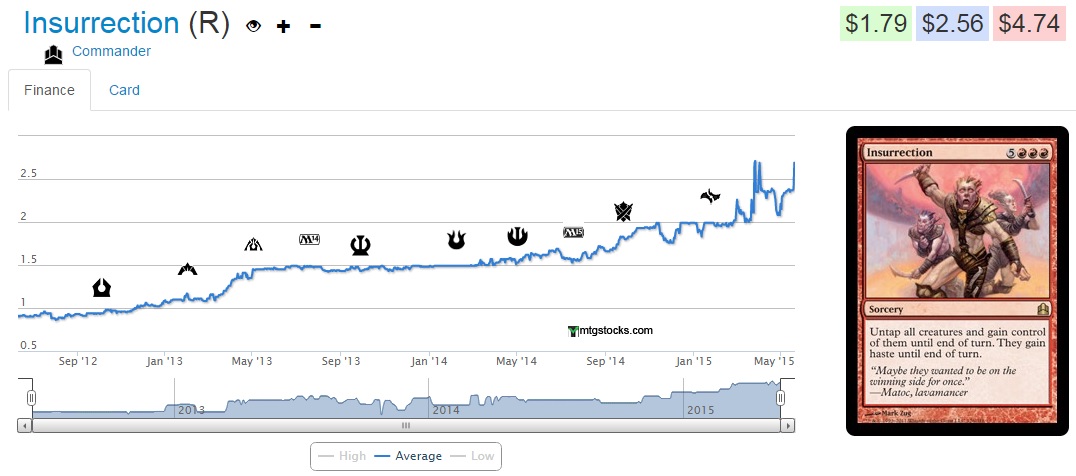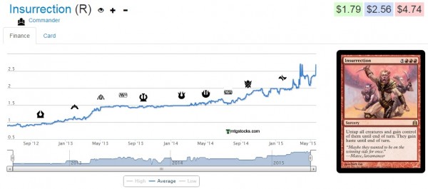 6. Insurrection (Commander) (+13%) - This Commander all-star is finally seeing an uptick, though with three printings (Onslaught, Planechase, and Commander) the upside is limited, though not nearly as much as it could be given that the two reprints were from shorter-print specialty products.