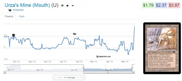 3. Urza's Mine (Mouth) (Antiquities) (+15.7%) - There are currently closer to 50-60 copies of this listed on TCG Player currently, which isn't a tremendous amount, but enough that a single seller couldn't likely affect the price without posting it as something astronomical. The tron lands all managed to bypass a reprint in MM2015 (which is honestly a bit surprising given the fact that they brought back Eldrazi).