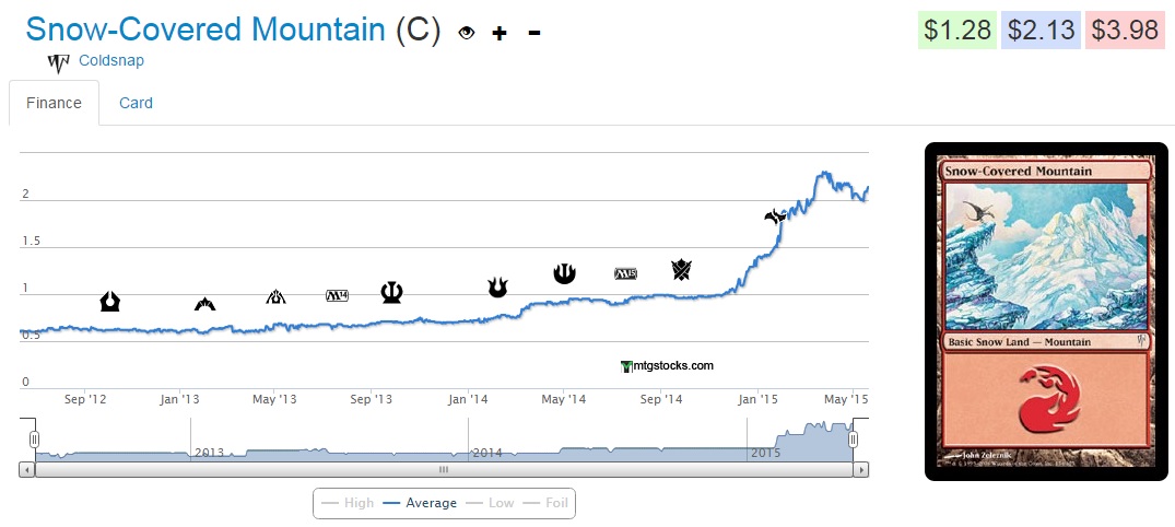 9. Snow-covered Mountain (Coldsnap) (+7%) - This one seems a bit odd, until you realize that Skred Red has been picking up steam in Modern as the lands are the same as mountains...but they often turn Skred into an instant-speed Flame Slash (which is often what these red aggro decks need to get past a Spellskite without using up two cards.