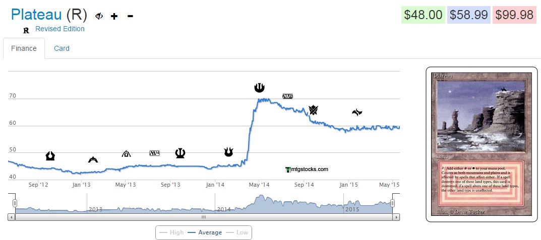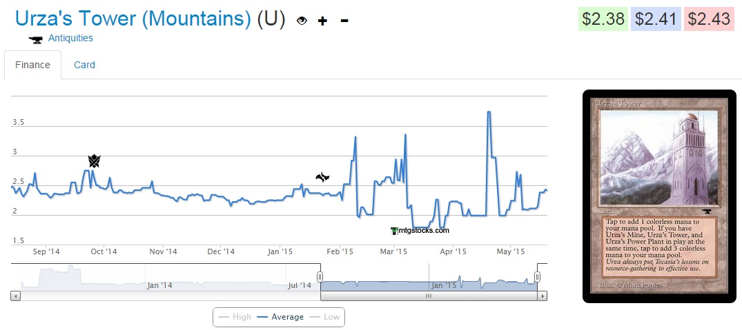 4. Urza's Tower (Mountains) (Antiquities) (+15.2%) - Similar to Urza's Mine above, there are again over 50+ copies of this card on TCG Player currently and it dodged MM2015 reprint...this is the most "pimp" version you can get that isn't foil.