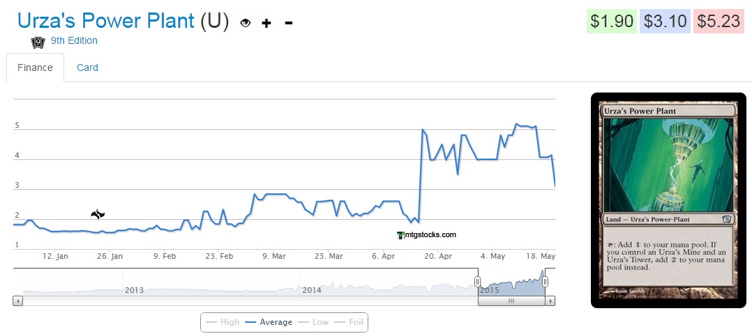 2. Urza's Power Plant (9th Edition) (-19%) - This one is likely due to some additional ones being posted on TCG Player. The total number of them listed on TCG Player (as of me typing this up) is 20. Given TCG Player's algorithm, if one or two people list a few at TCG low they can easily lower the mid price by a decent amount (which always happens with outliers and small populations of data).