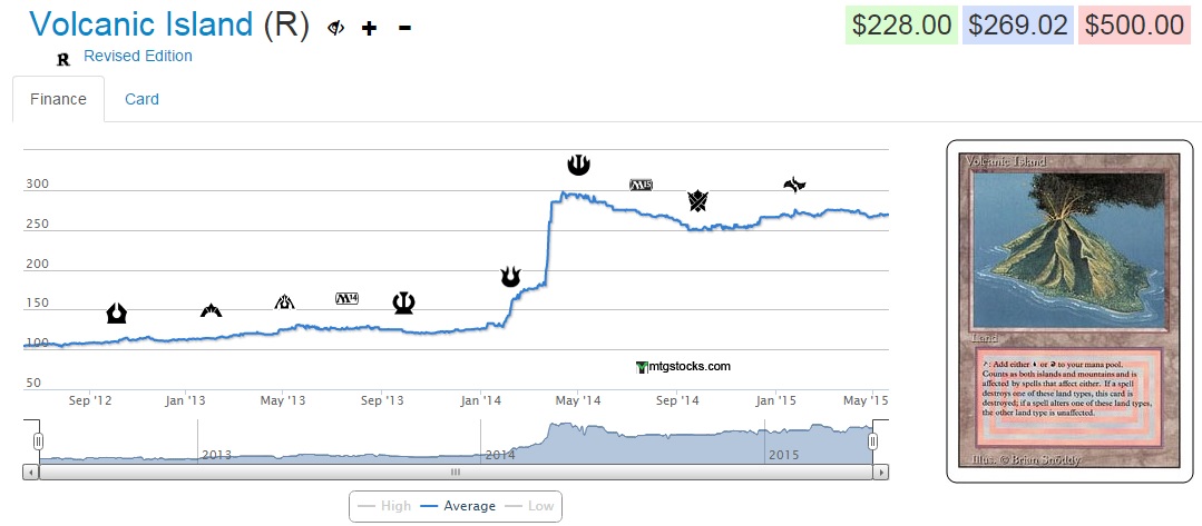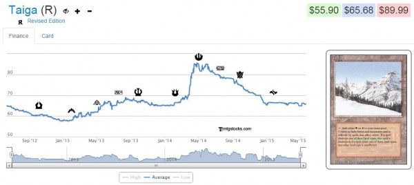 8. Taiga (+1.05%) - I'm honestly not all that sure on this one. This dual is typically only seen in Jund and Lands decks and neither of those seems to be having any sort of resurgence (Lands mainly because of the cost of Tabernacles and the fact that it is typically a very slow deck) and Jund because it doesn't have blue in it. It's important to note that Taiga has actually returned back to its pre-spike price of last March/April.