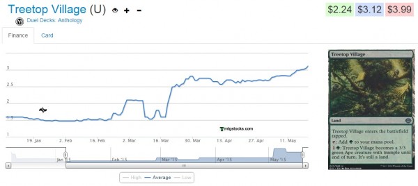 8. Treetop Village (Antholigies) (+8.2%) - With the banning of Treasure Cruise and Birthing Pod, we've seen an uptick in Junk Modern decks and this is often one of the more preferred manlands for said deck (though I'm a bigger fan of Stirring Wildwood myself). The trample is crucial with all the Lingering Souls tokens abounding everywhere.