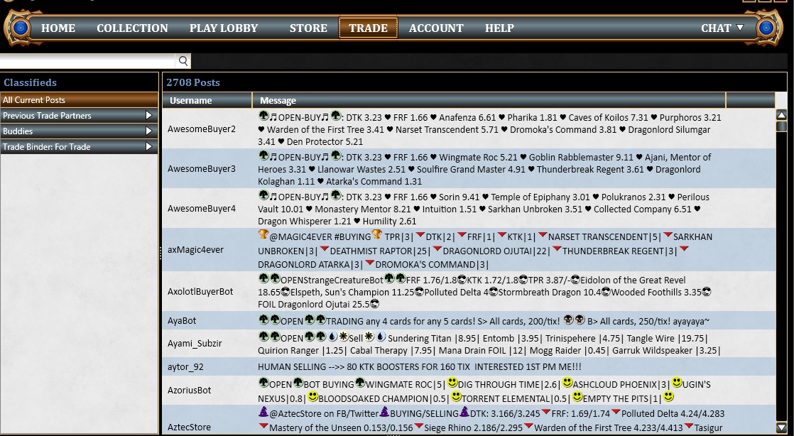 - There is a limit to how many cards you can get at one time, so you might be forced to do several transactions, but in order to make sure you get everything hit "ctrl+A" for a select all and pull one set at a time into your "trade for" section. Depending on the set, you may be able to get 1-2 sets at a time (due to the card limit). Then the bot will calculate how many tickets you owe and you simply follow the same trade procedure mentioned above.