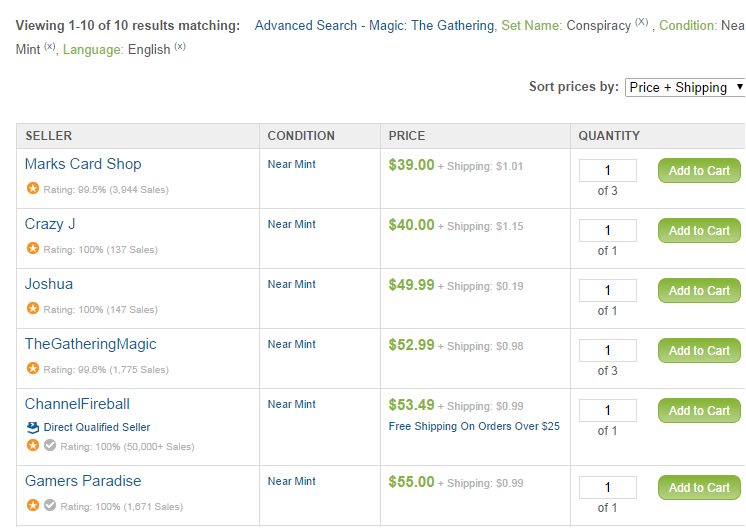 As you can clearly see, when more people catch on about the "spike" sellers will starts scrambling to get as much profit as they can from the copies being held, or extras in inventory. So one can determine from the trends, that there wasn't much to be had on this particular card. While the "spike" and percentages look very appealing, this was a sell-side buyout; it could just be one person trying to manipulate the market by clearing out one market. In this case it was TCGPlayer, and every other site followed suit, but there were (and still are) copies out there in the 30$ range. As the pushback from buyers starts to settle in, multiple sellers trying to under-cut each other will continue to undercut driving the price further downward.