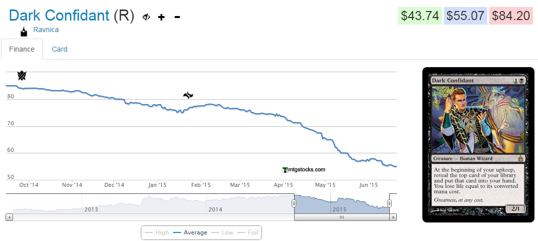 #2 Dark Confidant (-3.68%) - Poor Bob continues his downward slope, despite seeing an uptick in Modern play thanks to the resurgence of Jund decks. I honestly do believe he'll reach his low point soon and should those Jund (and/or some Junk) decks begin to perform better, I think we'll see a return to greatness. Though it is unlikely he'll get all the way back to his old $75 days...at least as long as he keeps showing up in Modern Masters print runs.