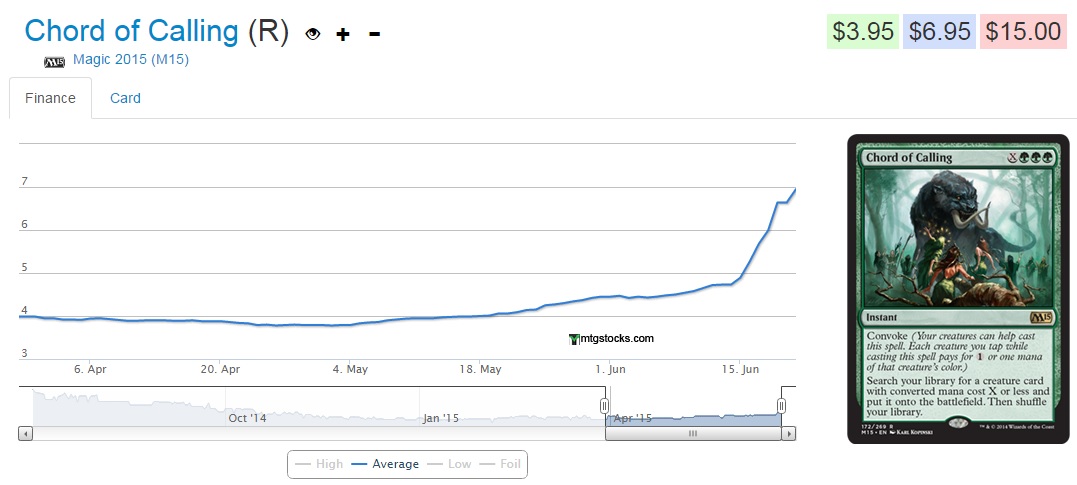 #8 Chord of Calling (+46.9%) - I've been calling this one for a while now and it seemed like an obvious speculation target. With CoCo Elves's win at the GP and the fact that it's running a full four-of Chord of Calling, this once-$40 Modern staple is finally getting its upward push after the reprinting in M15 caused it to plummet.