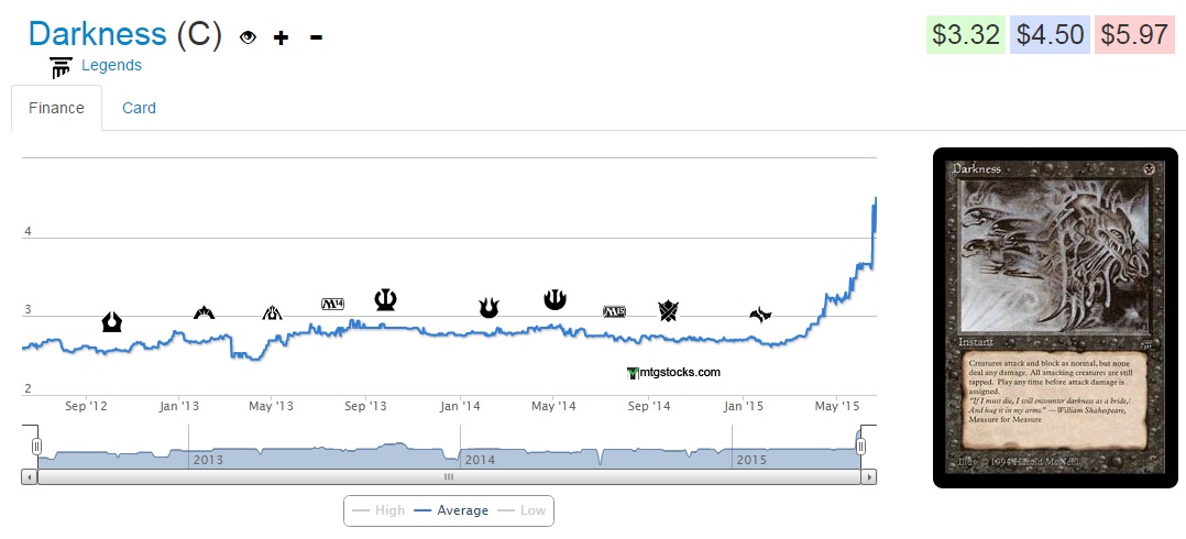 #11 Darkness (+25%) - This Legends common (reprinted as a Timeshifted card in TSP) got some time on air during GP Charlotte via the commentators (despite not actually being cast). The relatively small number in the market meant that any sort of increase in demand would likely cause a decent rise.