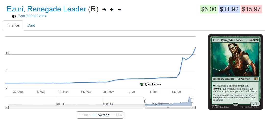 #3 Ezuri, Renegade Leader (C14) (+261.2%) - The winner of GP Charlotte was CoCo Elves, and Ezuri provides not only the win condition (Overrun on a stick) but also a way to protect your other pieces with the targeted regenerate ability. The original Scars of Mirrodin version also showed spectacular growth (+235.7%). We saw some of the other CoCo Elves pieces jump as well--namely Heritage Druid (+36.4%) and the next item on our list.