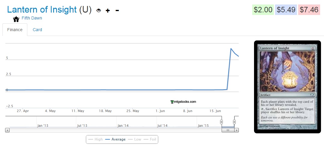 #2 Lantern of Insight (+1730%) - Another breakout star from GP Charlotte. This card ended up in prison style deck that uses the information it provides as a way to control your opponent's draw. The deck runs cards like Codex Shredder and Pyxis of Pandemonium to mill the top card of the opponent's library and keep them locked out.