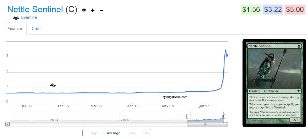 #4 Nettle Sentinel (+242.6%) - Following in Ezuri's and Heritage Druid's footsteps, one of the key components of all Elves deck (Modern or Legacy) is Nettle Sentinel as its ability when paired with Heritage Druid allows for large amounts of mana very quickly. Its ability gets around summoning sickness (which is key to keeping the deck's velocity high).