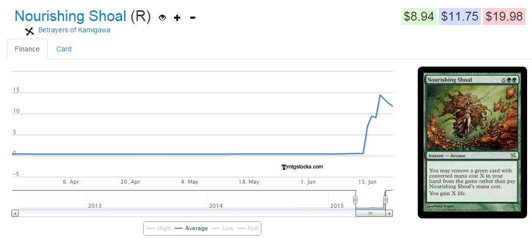 #1 Nourishing Shoal (+1961.4%) - This was the sleeper breakout card from GP Charlotte. It's played in a Tinfins style deck (i.e. discard and reanimate Avacyn and Griselbrand as fast as possible, draw a bunch of cards, win) as a way to gain a lot of life for free to continue drawing cards. The deck's new win condition is Borborygmos Enraged, who throws a bunch of lands at your face after they've all been drawn.