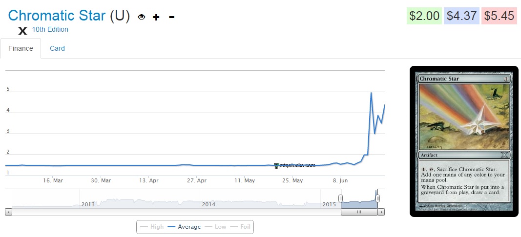 #7 Chromatic Star (+161.7%) - A key card in the R/G Tron lists, this one seems more like a buyout of the 10th Edition copies than an overall increase in demand--the regular Time Spiral (TSP) copies have only moved by about 25% in the same time period. However, it's important to keep an eye on this one as if we continue to see TSP copies move upward we may likely see the other R/G Tron pieces begin to grow.