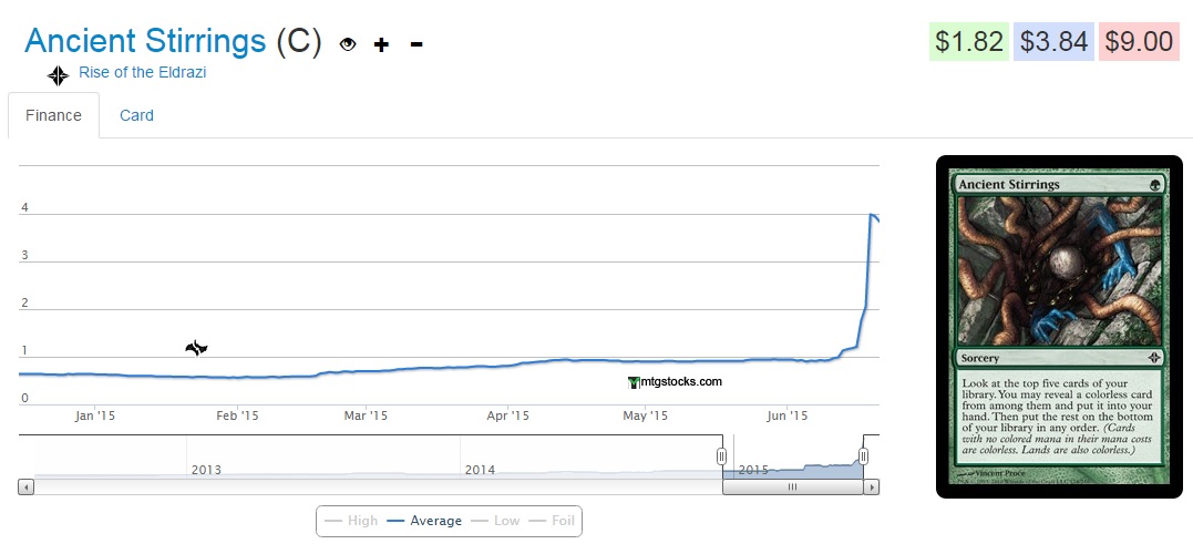 #5 Ancient Stirrings (+231%) - While Elves may have won GP Charlotte, the two decks going in with the biggest targets on their head were R/G Tron and Titan Bloom, both of which use Ancient Stirrings to help find key components. With only the singular printing in Rise of the Eldrazi, it's not a huge surprise to see a mini-tutor for one green breach the $3 mark (and almost the $4 mark).