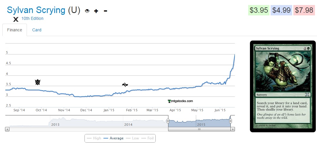 #10 Sylvan Scrying (+27.6%) - Similar to Ancient Stirrings, a green tutor for lands is incredibly powerful in both Modern and EDH. With its last printing coming in 2007 it's no surprise that the number of copies in the supply is beginning to dwindle.