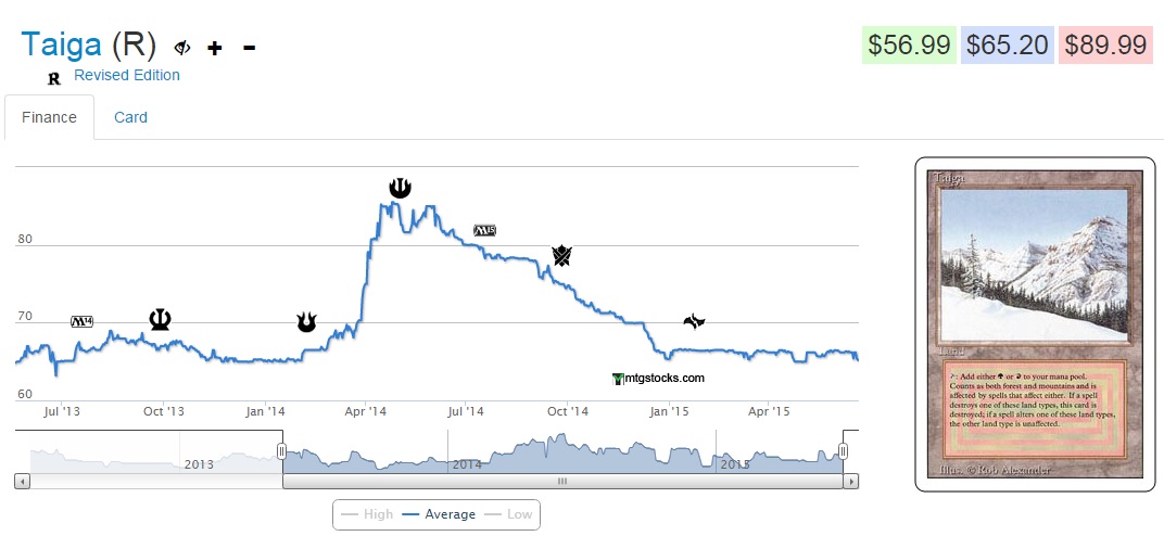 #5 Taiga (-1.88%) - As expected, Taiga still sits near the bottom of the dual land barrel. We can see it's now back to its pre-spike price. This emphasizes how the post-GP Richmond spike last year was due to an opportunistic short-term demand (when players realized they could convert some of their Modern staples that recently skyrocketed in price into something more stable).