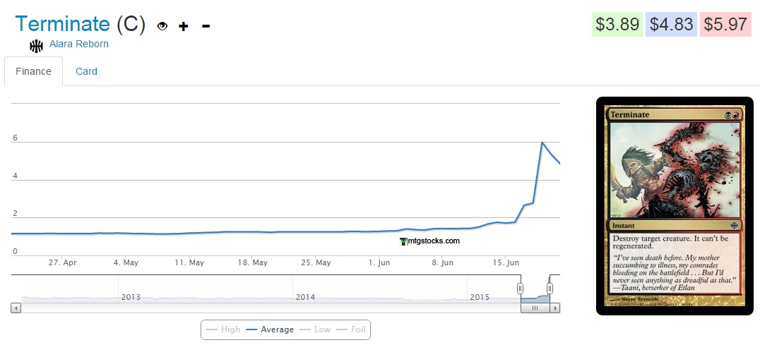 #6 Terminate (+176%) - Arguably the best creature removal spell in Modern (with the other possibility being Abrupt Decay), with the resurgence in modern Jund decks as well as the new Grixis Control decks popping up, it's no surprise to see this card finally get some love.
