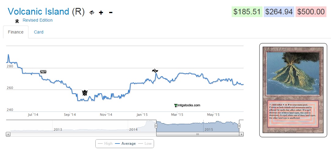 #4 Volcanic Island (-1.89%) - It looks like Volcanic's shot at passing Underground Sea is slowly diminishing as the death of U/R Delver decks (with the loss of Treasure Cruise) and the change from Sneak and Show to Know and Tell is reducing the need for Volcanics over all. The resurgence in RUG Delver strategies, however, should help offset this trend a bit moving forward.