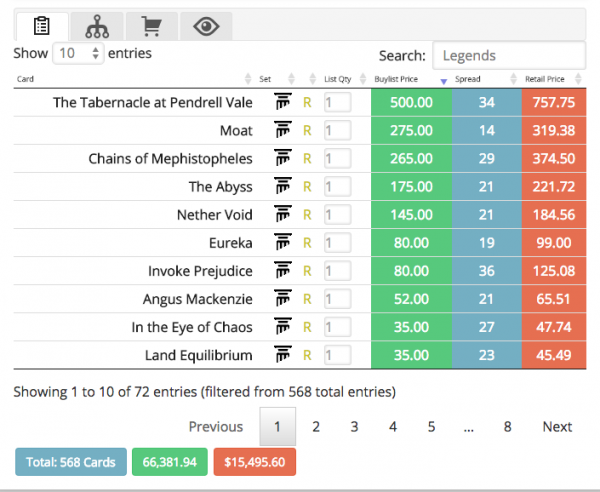 First of all, Editions and Lists had been loading really slowly. We spent some time looking into the architecture that processes List & Editions prices, and found a few places we could make some serious performance tweaks. After making those adjustments, I think its safe to say that your lists will load at least 5 times faster, maybe even more. Trader Tools was previously choking on lists over a few thousand cards, but with these performance enhancements, larger lists should be accommodated without any trouble.