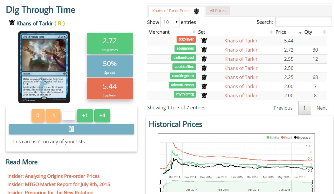 The most powerful blue card in Standard is arguably Dig Through Time, which has already proven its power in Legacy as well. The fact that it's in Khans and won't rotate also means that it has more time for a price rebound in Standard. The one concern is the potential for a banning in Legacy (and while I don't think it will occur, it is possible given the card's power level and the recent dominance of decks utilizing it).