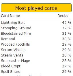 It's also important to note that these five decks make up 45% of the expected metagame, so there's a very high likelihood that if you were to play in a bigger event you'd play against at least one if not several of these decks. Below we can see the most played Modern cards: