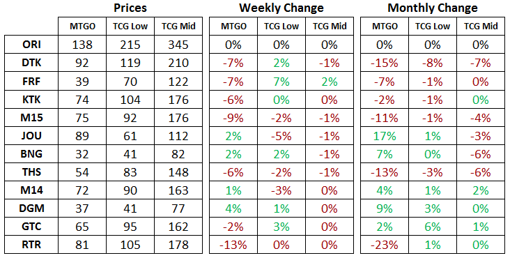 All three Tarkir block sets are off by over 5% this week with the start of ORI prerelease events. This is a temporary dip in reaction to the announced changes to Constructed prizes as well as a normal sell off at the beginning of a set release. At the tail end of DTK and FRF drafting, both sets are at attractive prices on MTGO and relative to paper prices.