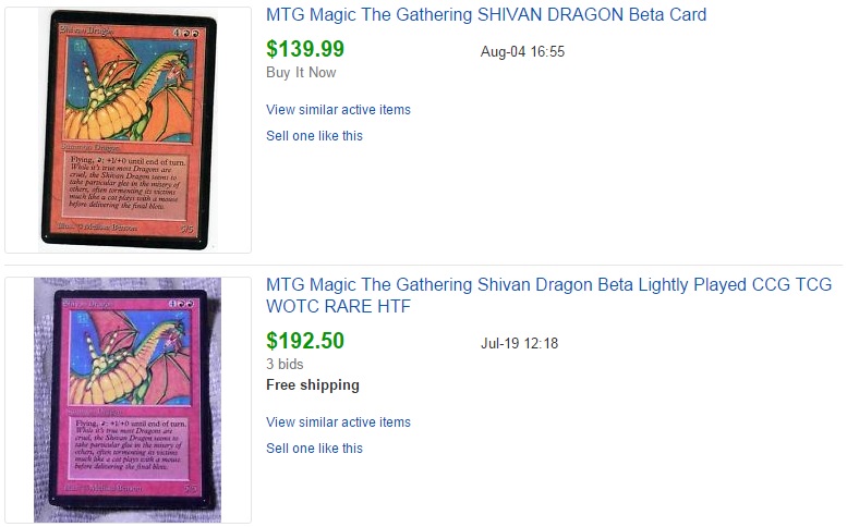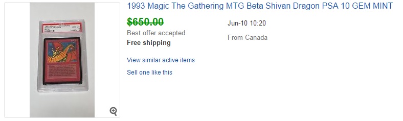 Last but not least we have graded cards. These tend to be from the earliest Magic sets and are typically only the most valuable cards, because the cost of grading is static (i.e. a flat $5-$15 per card). However, as those older Magic cards age and become rarer their price goes up and the justification for getting them graded also goes up. For a quick example, here are some prices for Beta Shivan Dragons: