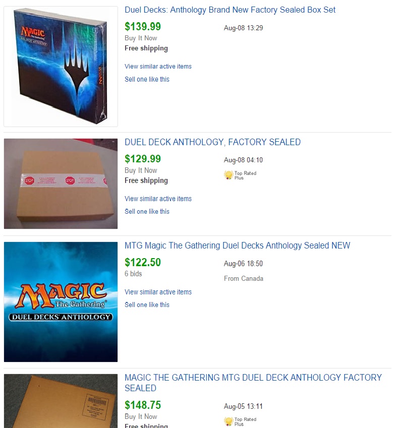 Of course, WoTC makes other specialty products that are more massively printed and require a lower initial investment, like Commander products, duel decks, or event decks. When it comes to these products one of the most important factors is the value of the singles inside them. For example, the 2013 Commander deck Eternal Bargain is the most valuable of the decks from this time, currently selling for around $35 on eBay (whereas many of the others are sub $25). Compare this to the original Commander decks which released in 2011; the lowest value one (Devour for Power or Political Puppets) goes for an easy $100.