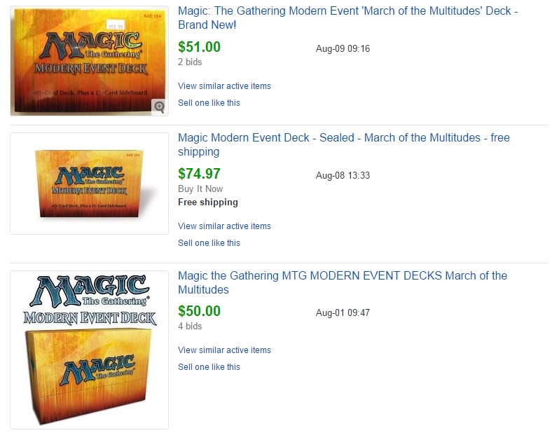 However, if we look at a different type of specialty product, say the Modern Event deck "March of the Multitudes", we see them selling on eBay for less than MSRP ($55 compared to $75), so purchasing these anywhere near MSRP and sitting on them until now would mean you're still in the red.