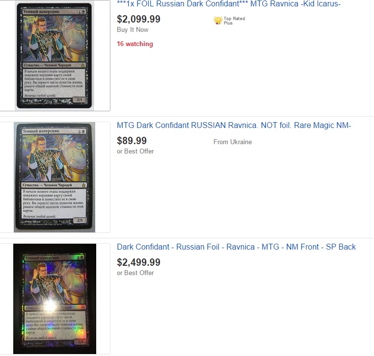 This sort of stability does give the "pimp" version a leg up on any other version of a card. The problem with these again goes back to liquidity--no Russian foil (Ravnica) Dark Confidant has sold in the past three months on eBay (and likely for even longer). So while the value remains stable, cashing out seems quite difficult. SCG doesn't even have this card on their buylist, so there's not an easy option to unload them currently.