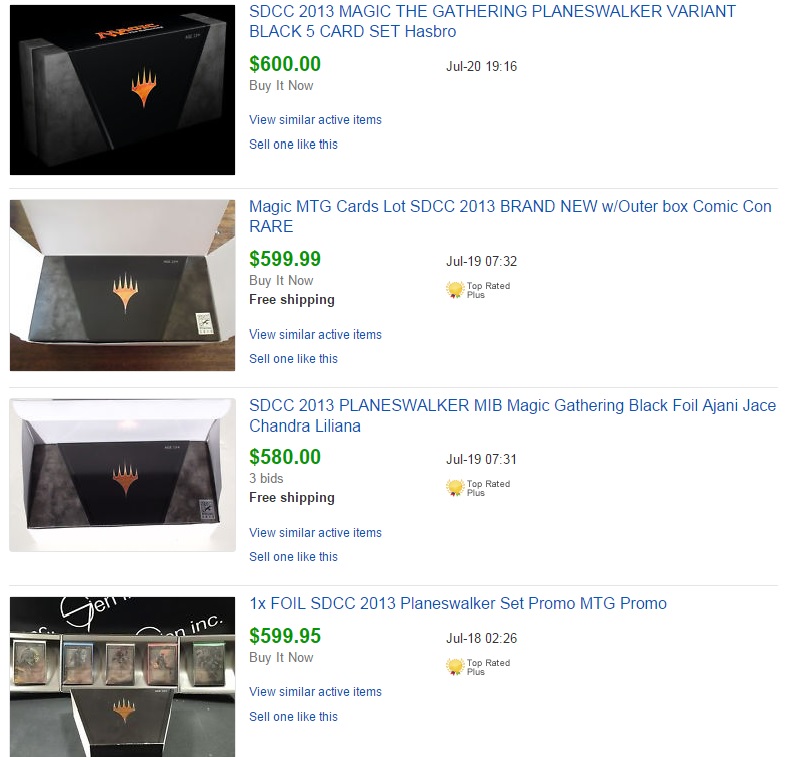 Another option is investing in specialty product (like the SDCC planeswalker sets). If we look at the original SDCC 2013 planeswalker sets, they are currently going for $600 on eBay and selling for that price with some consistency. They could originally be purchased onsite for around $150, but easily were reselling for closer to $300 when people realized how rare they were. In two years they've doubled in value.