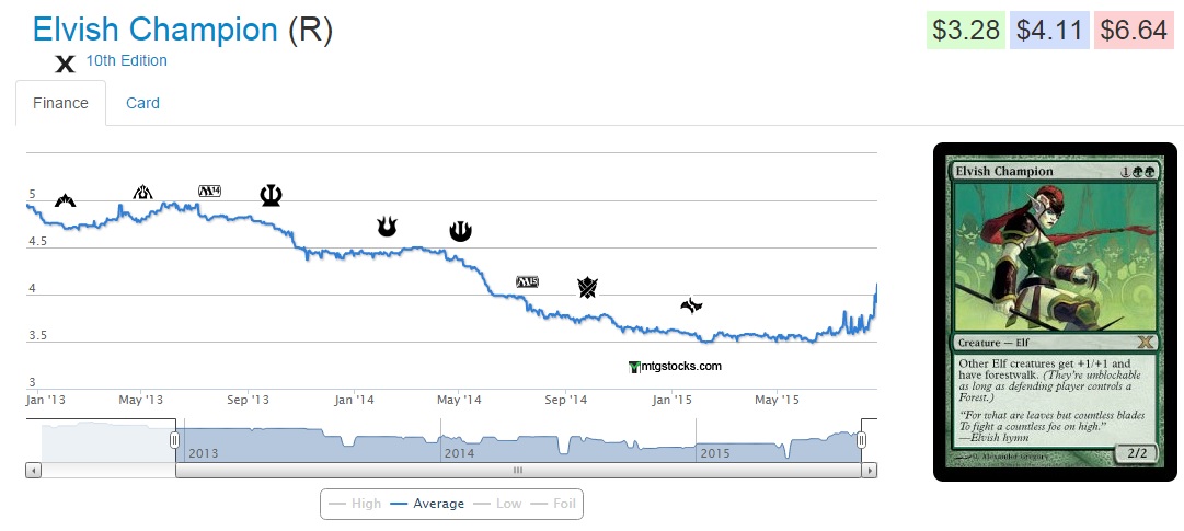 #8 Elvish Champion (+9%) - Though this is an elf, it was not featured in Chris's list. Interest may be due to the fact that it can serve as a trump card in the mirror, by making all your elves unblockable or simply because elves are a popular tribe and this elf lord hasn't been printed in a while.